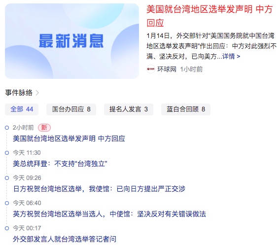 1、美国就台湾地区选举发声明+中方回应The United States issues a statement on Taiwan’s elections + China’s response(日,英祝贺;美拜登不支持台独;国台办:不能代表主流民意)