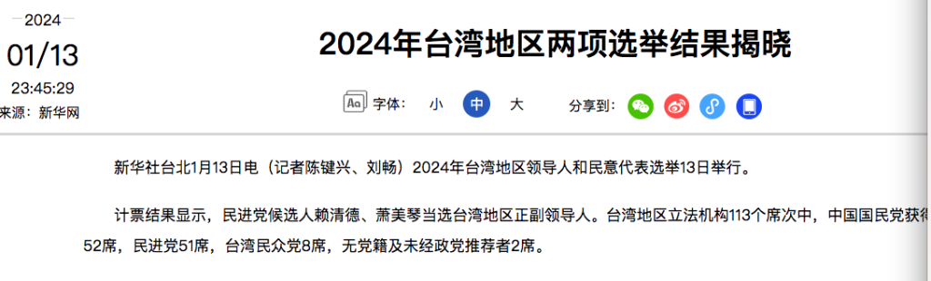 1、2024年台湾地区两项选举结果揭晓Results of two elections in Taiwan in 2024 announced(民进党候选人赖清德、萧美琴当选台湾地区正副领导人)