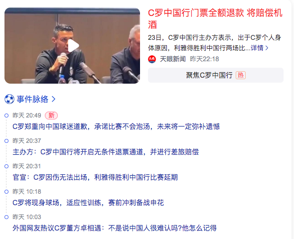 2、C罗中国行门票全额退款 将赔偿机酒Ronaldo’s tickets to China trip will be fully refunded and the flight and wine will be compensated