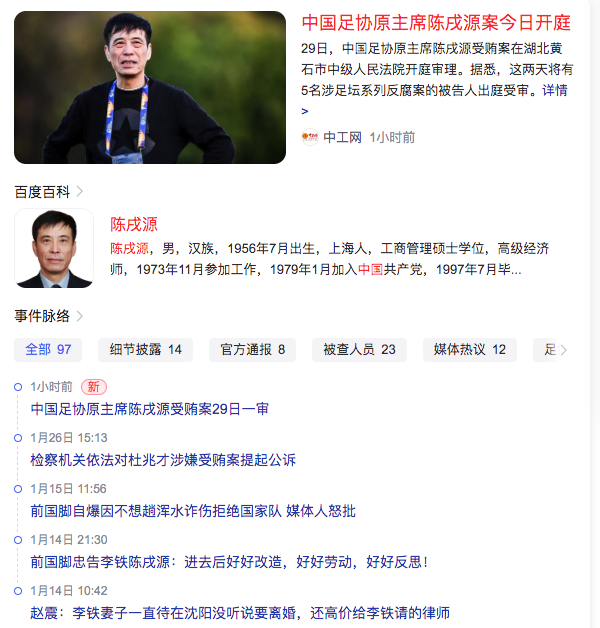 2、中国足协原主席陈戌源案今日开庭The case of former Chinese Football Association Chairman Chen Xuyuan opens today