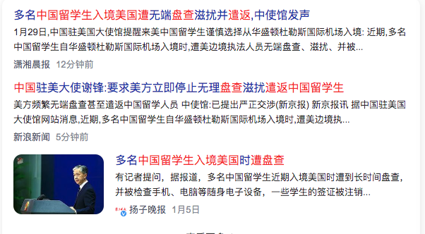 4、中国驻美大使谢锋:要求美方立即停止无理盘查滋扰遣返中国留学生Chinese Ambassador to the United States Xie Feng: Demanding that the United States immediately stop unreasonable interrogation and harassment of repatriated Chinese students(提醒谨慎选择华盛顿机场入境)