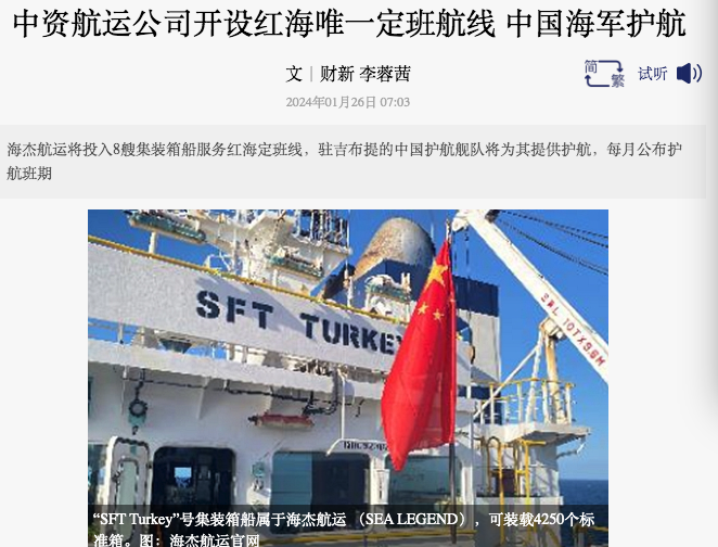5、中资航运公司开设红海唯一定班航线 中国海军护航Chinese-funded shipping company opens the only scheduled route in the Red Sea, escorted by the Chinese Navy