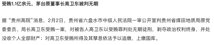 2、茅台原董事长高卫东被判无期Gao Weidong, former chairman of Moutai, sentenced to life