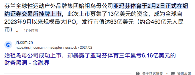 2、始祖鸟母公司上市Arc’teryx parent company goes public(中国公司全球化样本,安踏联合腾讯等2019年跨国收购;三年6.16亿美金财务黑洞;截至2023年9月,总资产为81.47亿美元,而总负债高达81.38亿美元)
