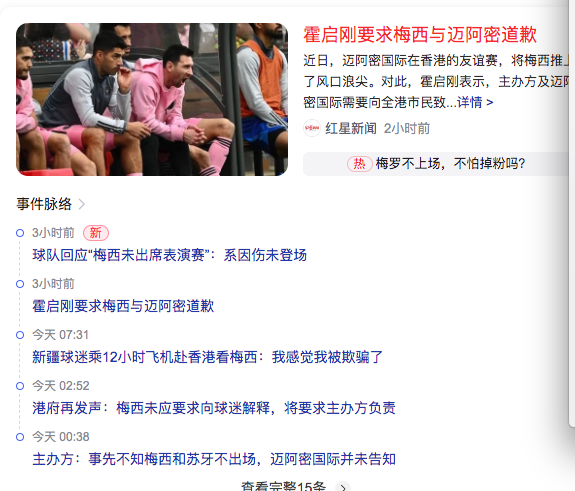 1、霍启刚要求梅西与迈阿密道歉Huo Qigang demands an apology from Messi and Miami(球队回应,因伤未登场)