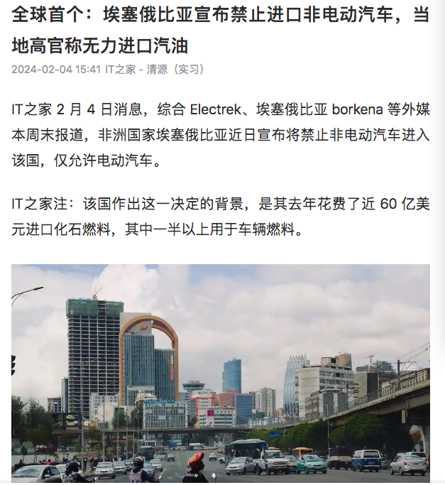 1、全球首个:埃塞俄比亚宣布禁止进口非电动汽车The first in the world: Ethiopia announced a ban on the import of non-electric vehicles