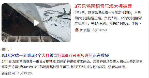 3、8万只鸡因积雪压塌大棚被埋80,000 chickens were buried after greenhouse collapsed due to snow(湖南常德)