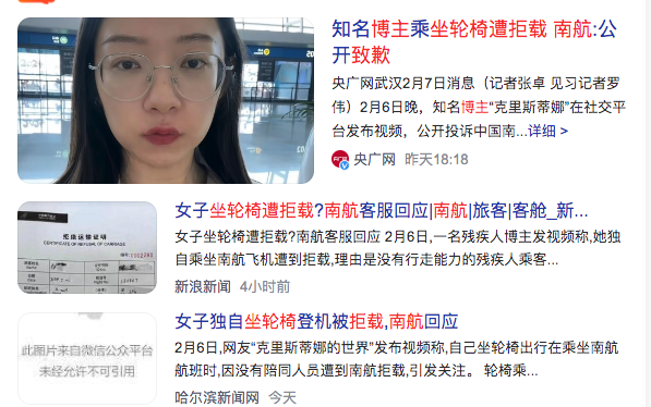 2、博主坐轮椅出行遭拒载 南航致歉Blogger was refused boarding when traveling in a wheelchair, CSN apologizes