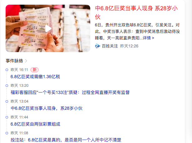 3、中6.8亿巨奖当事人现身 系28岁小伙The person who won the 680 million grand prize appeared and was a 28-year-old boy