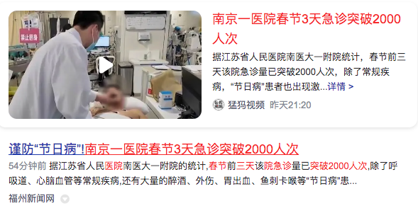 4、南京一医院春节3天急诊突破2000人次A Nanjing hospital’s emergency department visits exceeded 2,000 in three days during the Spring Festival