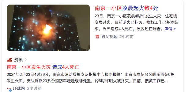 3、南京一小区凌晨火灾致4死An early morning fire in a Nanjing neighborhood killed 4