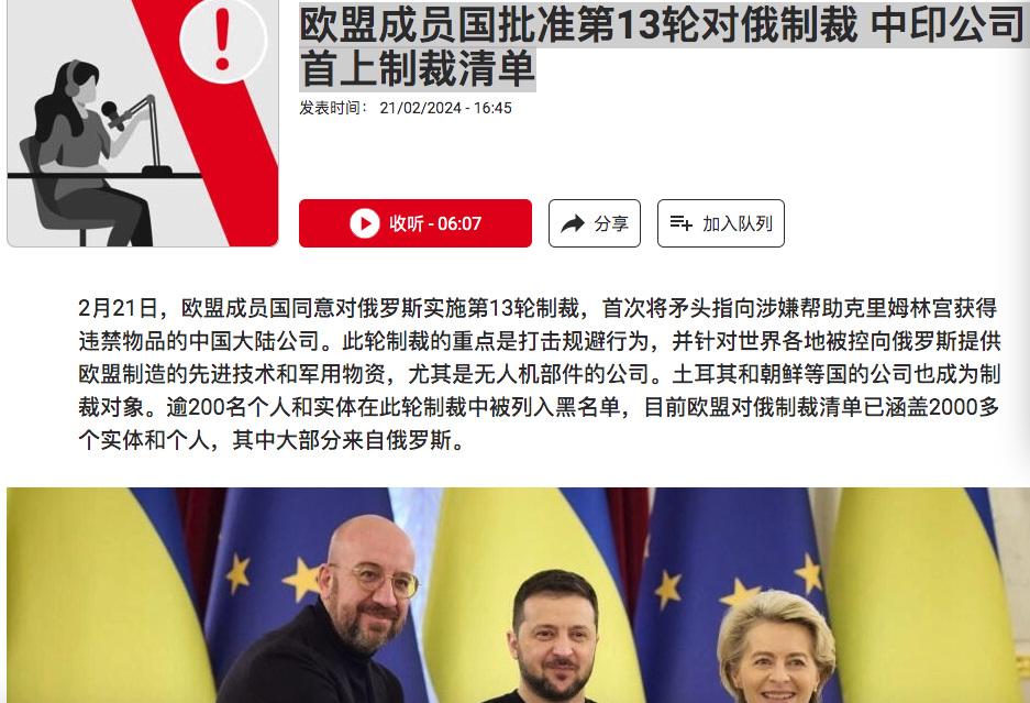 3、欧盟成员国批准第13轮对俄制裁 中印公司首上制裁清单EU member states approve 13th round of sanctions against Russia, Chinese and Indian companies first on sanctions list