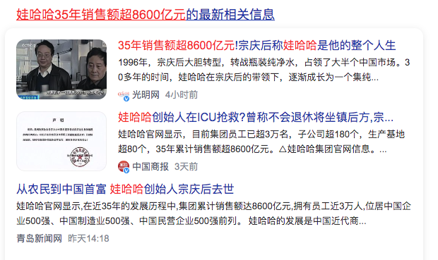 1、娃哈哈35年销售额超8600亿元Wahaha’s sales in 35 years exceed 860 billion yuan(马云发挽联悼念宗庆后:“人生搏击四十不晚,开拓者精神;创业千难夙夜求新,企业家本色。”)