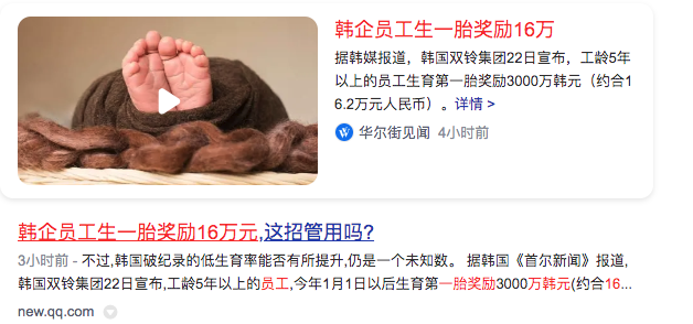 2、韩企员工生一胎奖励16万元Employees of Korean companies are rewarded 160,000 yuan for giving birth to a child