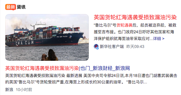 3、英国货轮红海遇袭受损致漏油污染British freighter attacked and damaged in Red Sea, causing oil spill(30公里长油带;苏伊士航运商业锐减42%)