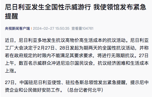 8、尼日利亚发生全国性示威游行 我使领馆发布紧急提醒Nationwide demonstrations occurred in Nigeria. Our embassy and consulate issued an urgent reminder