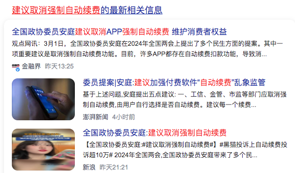 1、政协委员:建议取消强制自动续费CPPCC member: It is recommended to cancel mandatory automatic renewal