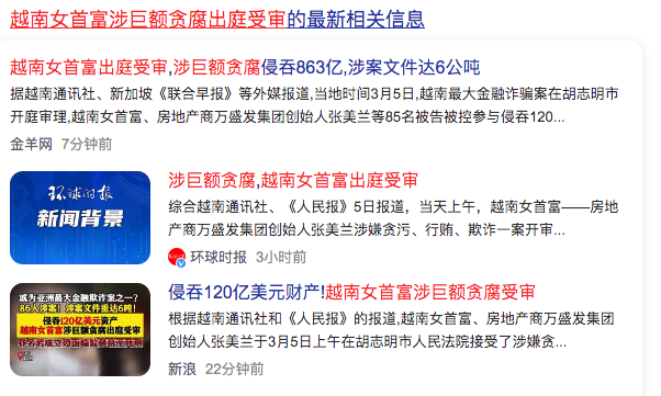 3、越南女首富涉巨额贪腐出庭受审Vietnam’s richest woman appears in court for massive corruption case(侵吞银行120亿美元受害者4.2万人起诉85名被告)