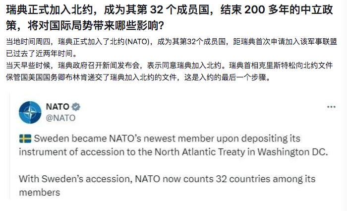 2、瑞典正式加入北约,成为其第 32 个成员国,结束 200 多年的中立政策Sweden officially joins NATO as its 32nd member, ending more than 200 years of neutrality policy