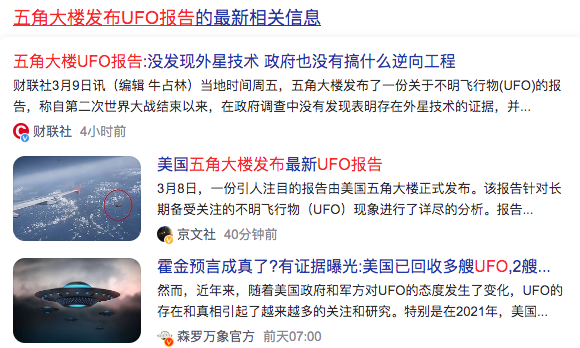 4、五角大楼发布UFO报告:未发现外星技术证据Pentagon releases UFO report: No evidence of extraterrestrial technology found