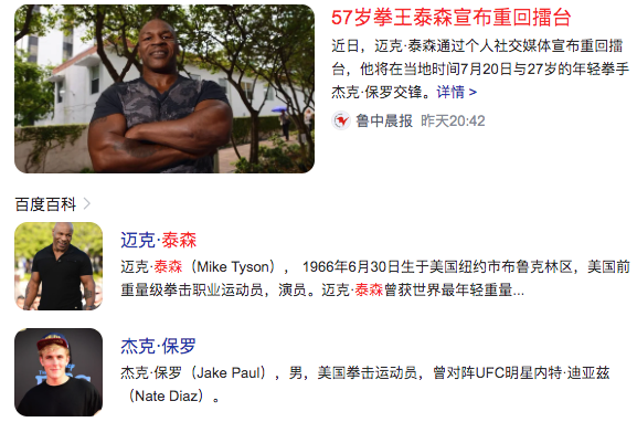 10、57岁拳王泰森宣布重回擂台57-year-old boxing champion Tyson announces return to the ring(对手27岁)