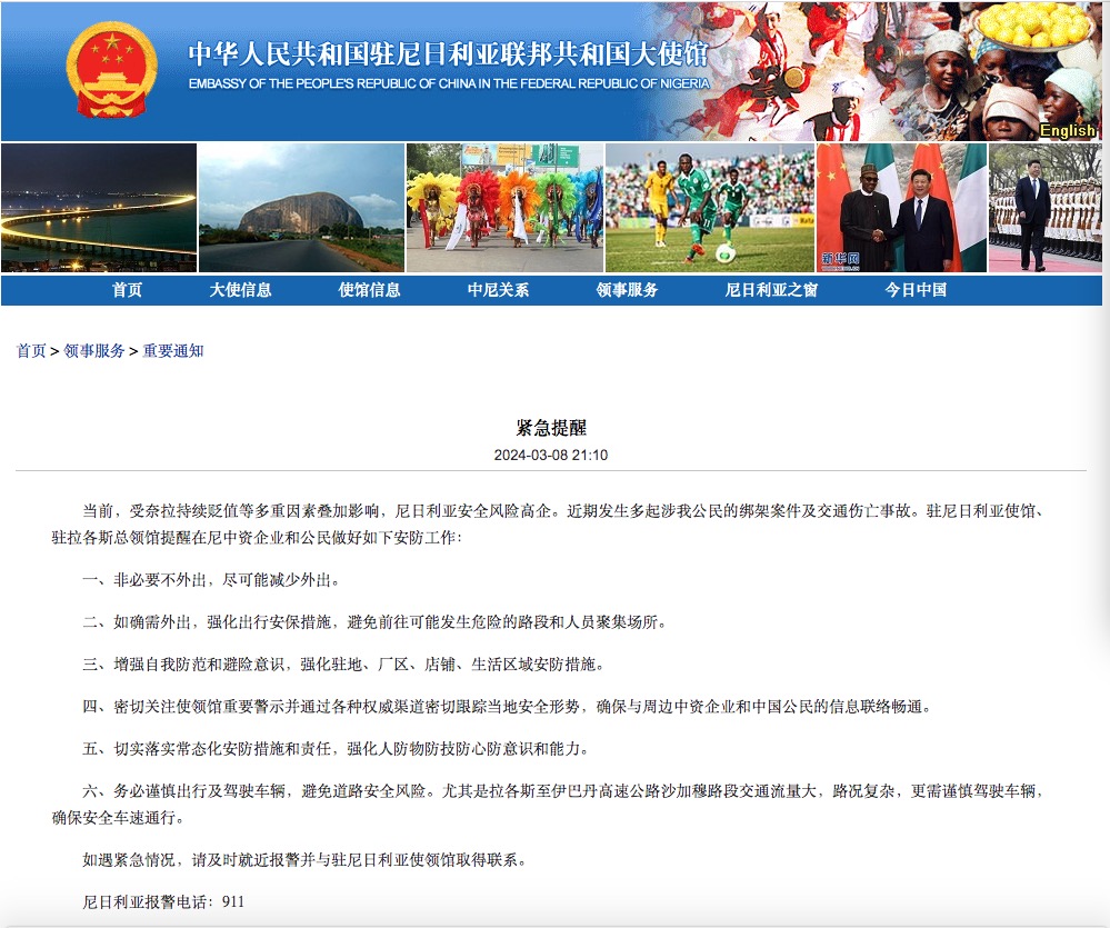 7、近期发生多起涉我公民的绑架案件,我驻尼日利亚使馆紧急提醒:非必要不外出There have been many kidnapping cases involving Chinese citizens recently. The Chinese Embassy in Nigeria urgently reminds: Do not go out unless necessary.
