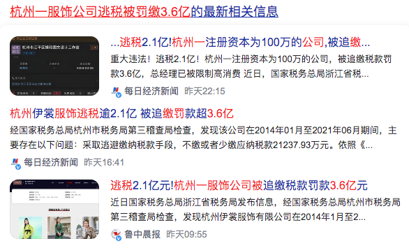 2、杭州一服饰公司逃税被罚缴3.6亿A clothing company in Hangzhou was fined 360 million for tax evasion