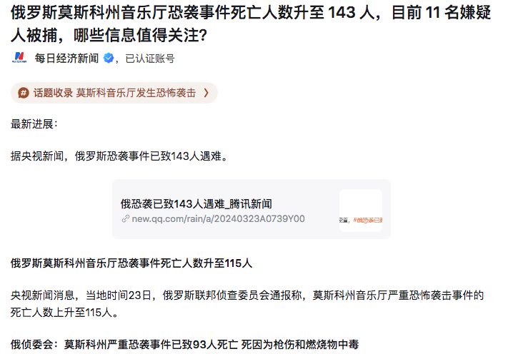 3、俄罗斯莫斯科州音乐厅恐袭事件死亡人数升至 143 人,目前 11 名嫌疑人被捕,324定为俄全国哀悼日