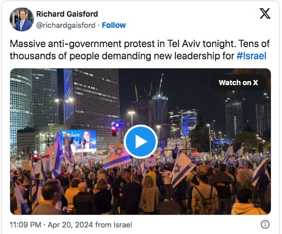 周六晚(20/4),数千人走上特拉维夫、耶路撒冷、贝尔谢巴、凯撒利亚、海法和其他以色列城市的街头,要求解雇总理本杰明·内塔尼亚胡并同意释放以色列人。哈马斯扣押的人质。