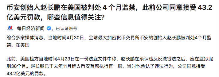 2、4月30日,全球最大加密货币交易所币安的创始人赵长鹏被判处4个月监禁(赵长鹏已于去年11月辞去币安首席执行官一职,承认了违反反洗钱法,公司接受43.2亿美元罚款)