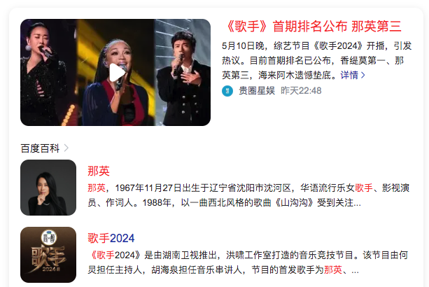 2、《歌手2024》首期排名公布+那英第三(看点:首次全程直播)