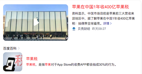 2、苹果在中国1年收400亿苹果税(苹果app store抽成高达30%,抽佣率全球最高)
