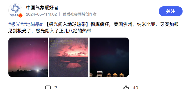 4、英国多地可见极光;美国佛州、纳米比亚、牙买加都见到极光了,极光闯入了正儿八经的热带