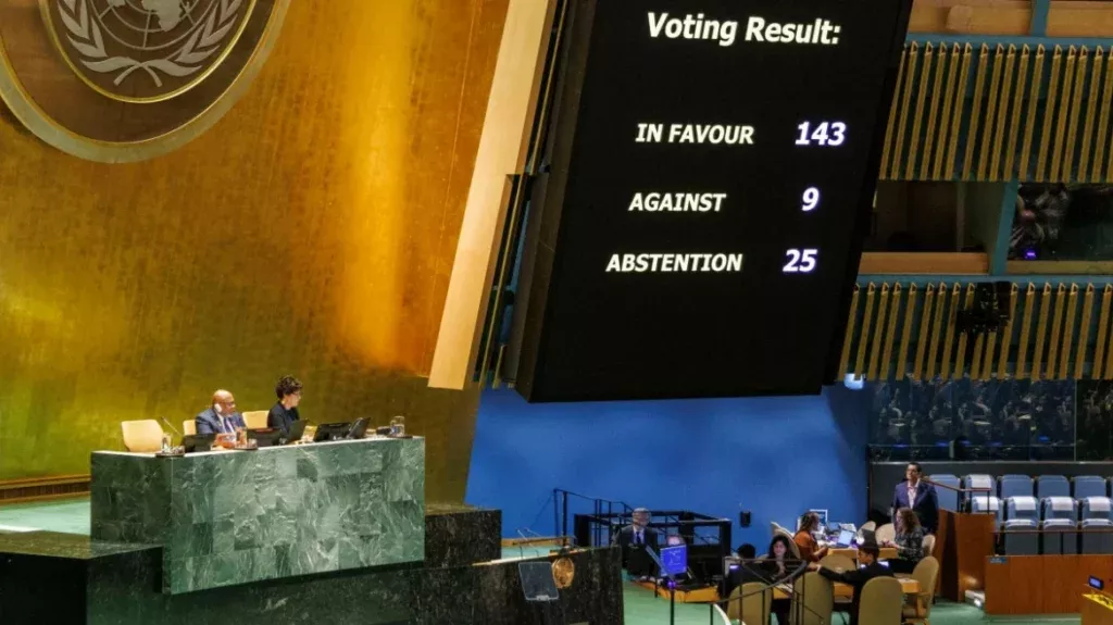 该案文以143 票对 9 票(包括美国和以色列)和 25 票弃权获得通过,并承认巴勒斯坦人符合成员国标准,应“加入本组织”,并给予他们一些作为“观察员”的额外权利。