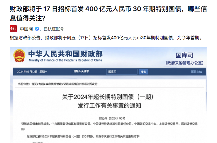 2、财政部将于 17 日招标首发 400 亿元人民币 30 年期特别国债