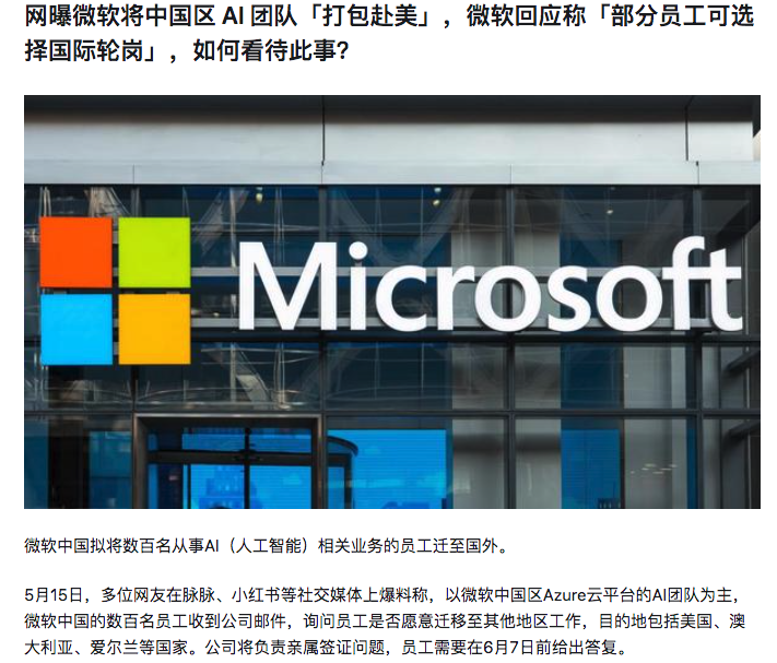 1、网曝微软将中国区 AI 团队「打包赴美」,微软回应称「部分员工可选择国际轮岗」