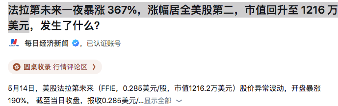 2、法拉第未来一夜暴涨 367%,涨幅居全美股第二,市值回升至 1216 万美元
