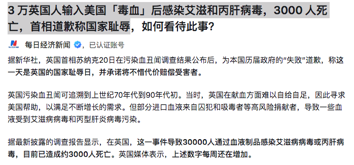 1、3 万英国人输入美国「毒血」后感染艾滋和丙肝病毒,3000 人死亡,首相道歉称之为国家耻辱日;据传全球94%的付费血浆都是美国供应,多国被牵连