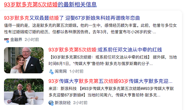 5、93岁默多克第5次结婚,迎娶67岁新娘