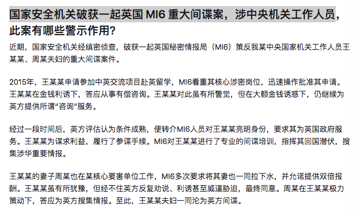 2、国家安全机关破获一起英国 MI6 重大间谍案,涉中央机关工作人员