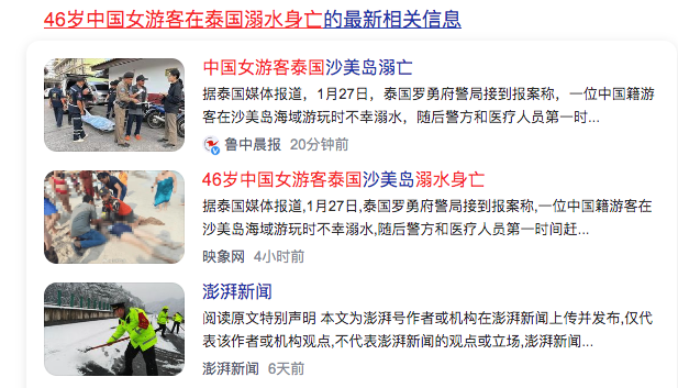 2、46岁中国女游客在泰国溺水身亡46-year-old Chinese female tourist drowned in Thailand