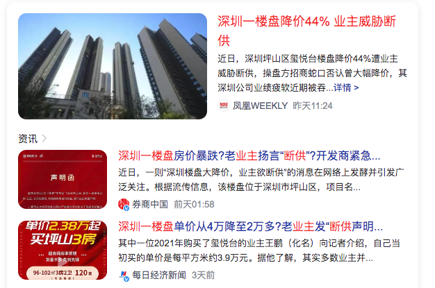3、深圳一楼盘降价44%The price of a real estate project in Shenzhen dropped by 44%