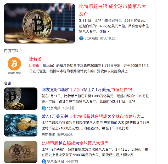 6、比特币超白银 成全球市值第八大资产Bitcoin surpasses silver and becomes the eighth largest asset in the world by market capitalization(最高破7.1万美元/枚)