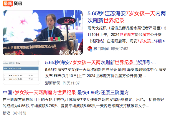 7、中国7岁女孩一天两刷魔方世界纪录7-year-old Chinese girl solves Rubik’s Cube world record twice a day