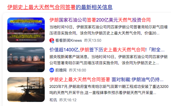 3、伊朗史上最大天然气合同签署Iran’s largest natural gas contract signed(200亿美金;南帕尔斯天然气田是该国最大的天然气田,占全国50%占世界7%)