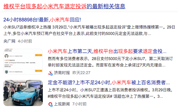 3、维权平台现多起小米汽车退定投诉