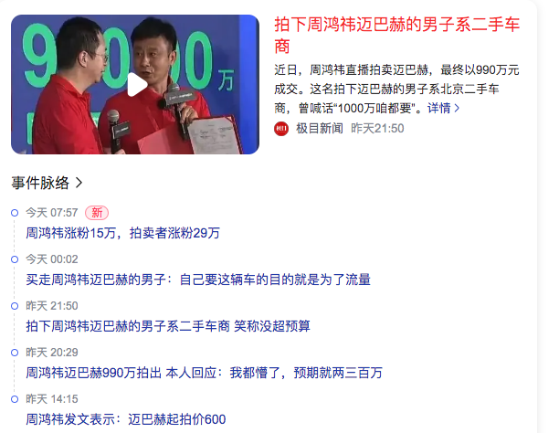 2、周鸿祎拍卖迈巴赫以990万元成交,拍者为北京二手车商